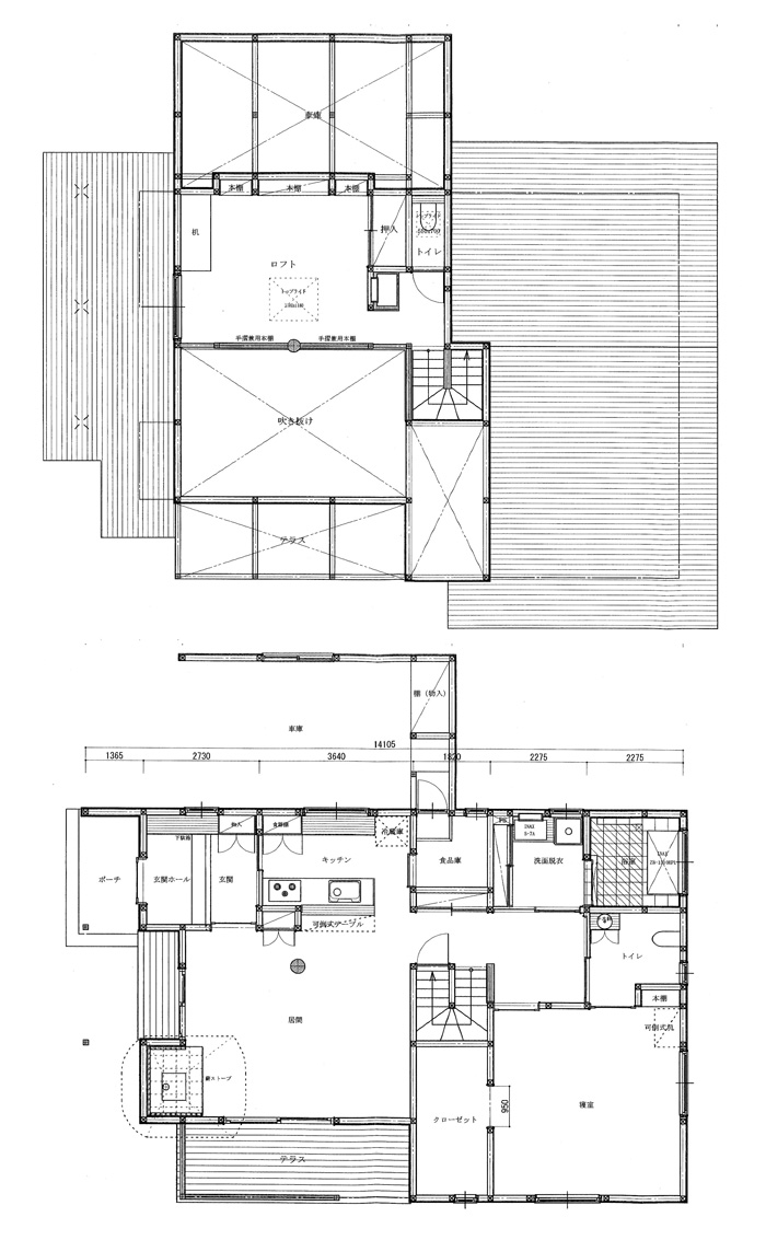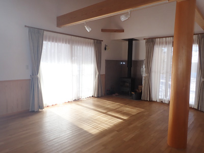 | 1階リビング…薪ストーブも設置、台所からは対面キッチンに。 | ||