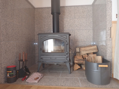 | 薪ストーブ、ドブレ社製です 薪は当社の方で手配できますので…お申し付け下さい。ちゃんと運んでくれますので笑 |